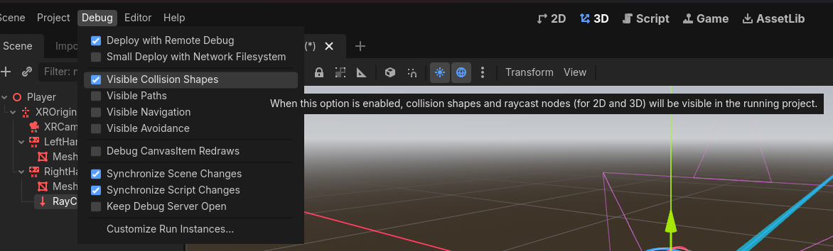 Finally, in the Debug menu at the top of the editor, go to Debug and check Visible Collision Shapes. This allows you to see active collision shapes and raycasts during play. This is for TESTING purposes only!