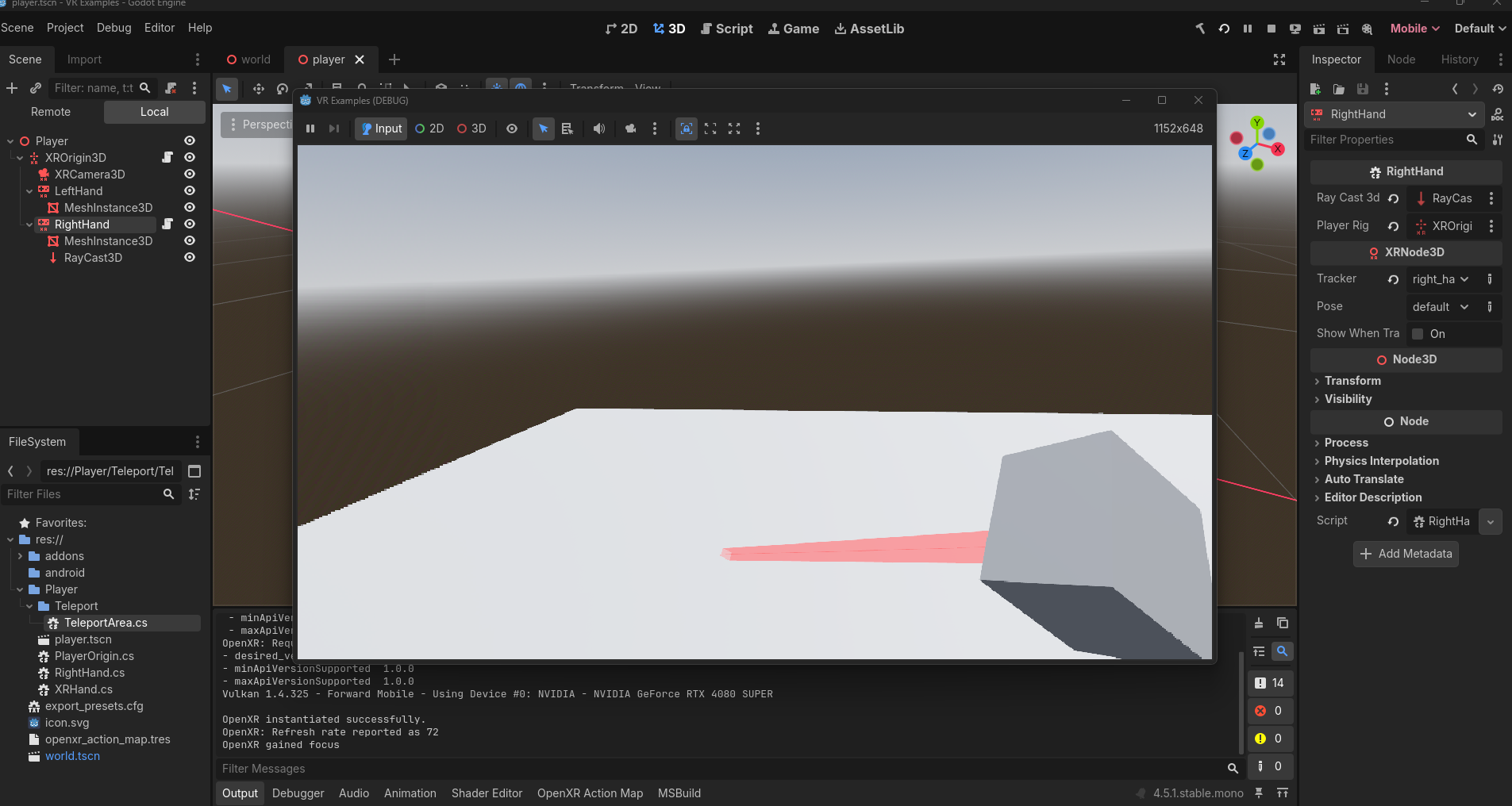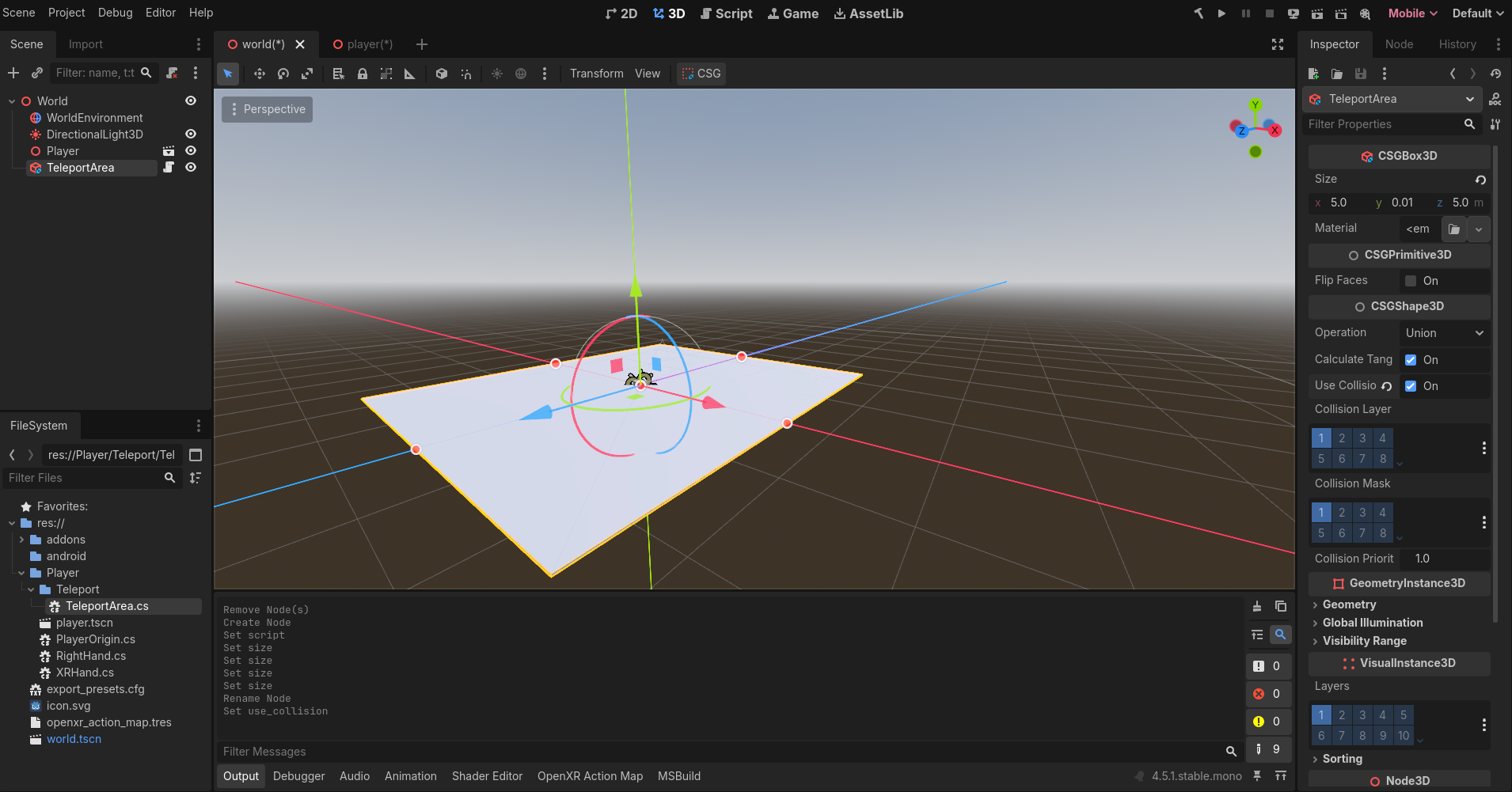 If you hit play now, you should be able to see your Raycast3D emitting from your controller. I would suggest here placing a CSGBox3D, check Use Collision, set the Size to something meaningful, like x: 5.0, y: 0.01, z: 5.0, and assign the script TeleportArea.cs to the Script entry.
