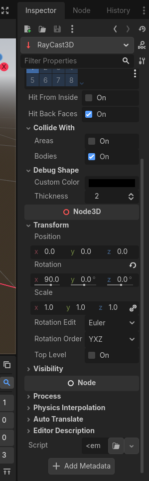 - Transform/Rotation: x: 90.0, y: 0.0, 0.0 (this will rotate the Raycast3D to point out from the aim of you controller)