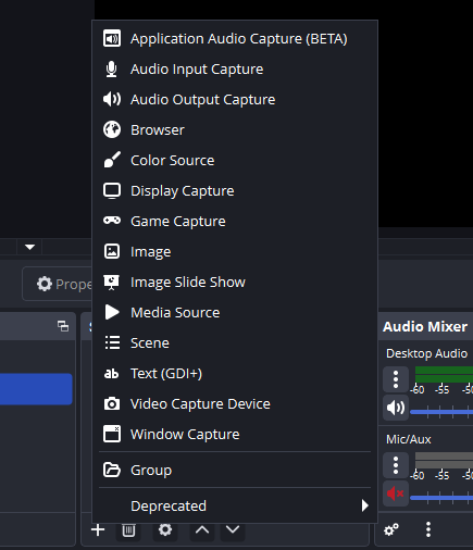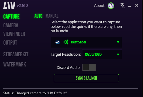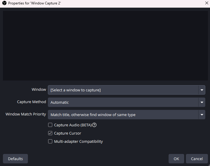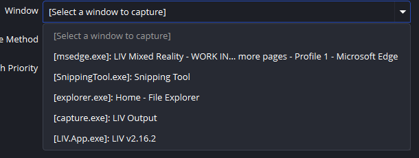 Click “Window Capture”. “Game Capture” will not work with the LIV output window, as it isn’t recognized as a game.