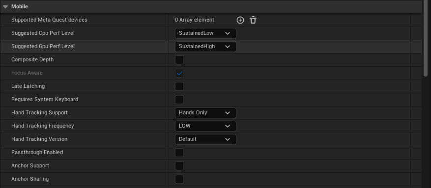 Go to Edit -> Project Settings -> Plugins -> Meta XR. Under the section for Mobile, set Hand Tracking Support to Controllers Only. The other default values are fine.