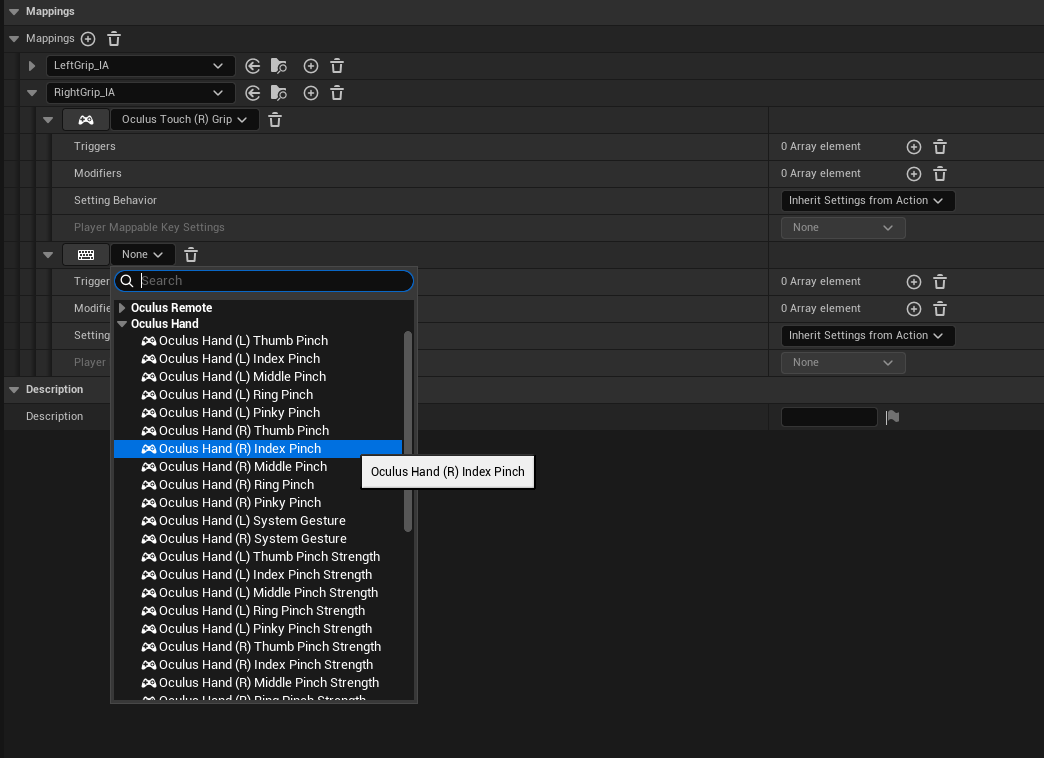 For input, such as pinch, you can open your input mapping context file and choose a mapping to add built-in gestures, such as below: